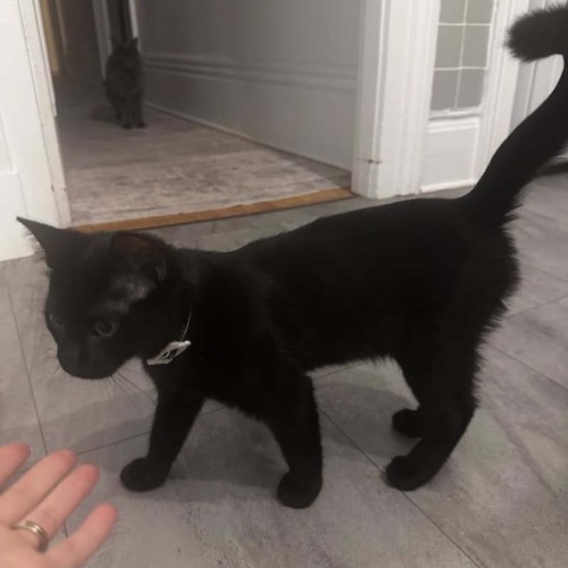 This pure‑black kitten was found off of a busy street in St. Catharines. He’s a friendly little guy with a collar and bell and was kept safe by a caring neighbour.So glad to share that this handsome boy is now back home. 💜🐾