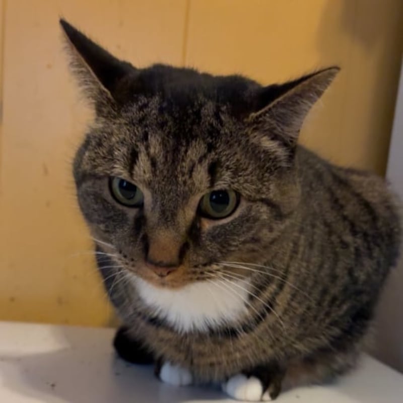 This intact male tabby with a white chest patch has been visiting the area since the summer. He’s very friendly and affectionate. No microchip was detected.